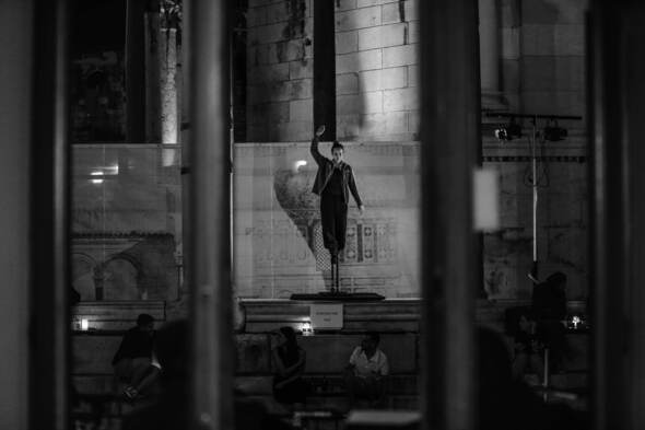 info Accept our invitation to a unique spectator encounter with performers and other spectators. Both bars of Akropolis Palace will be open for you during the performance. 'For As Long As We're Here’ is a series of performance installations whereby circus artists perform an uninterrupted durational performance of a single circus trick for up to 4 hours. Over the course of the performance the performers are slowly transformed by the weight of time and effort. The initial virtuosity of the action breaks down, and the artists, in all their strenght and vulnerability, are slowly revealed. This series of performances blurs the lines between art forms, raises questions around the role of the spectator, and places them responsible for defining their own experience. The project features a modular structure allowing it to be adapted for each location and context. So far, the work has been performed at various scales by nine different circus artists from different disciplines. Additionally, collaborations have taken place with various curators and musicians.